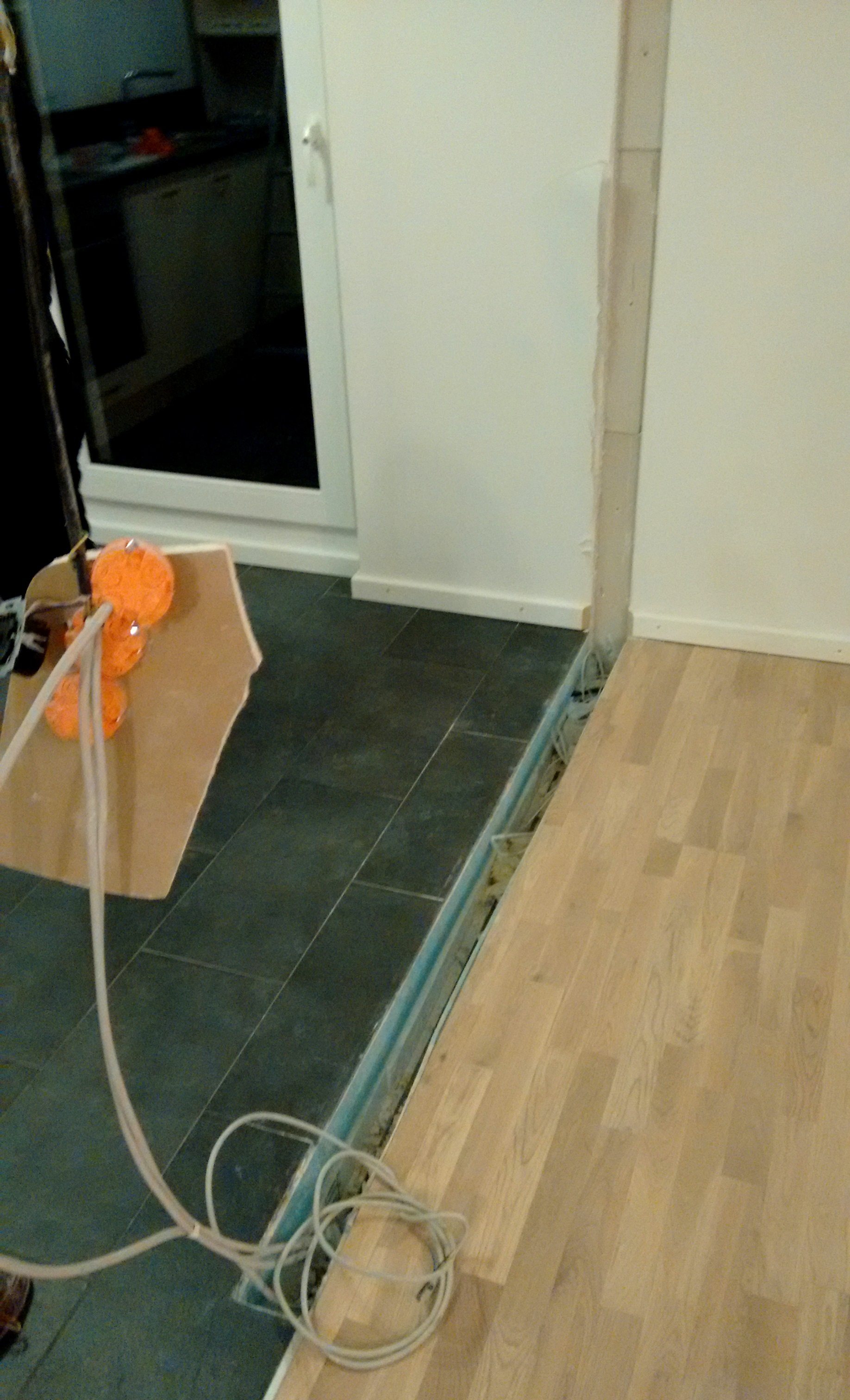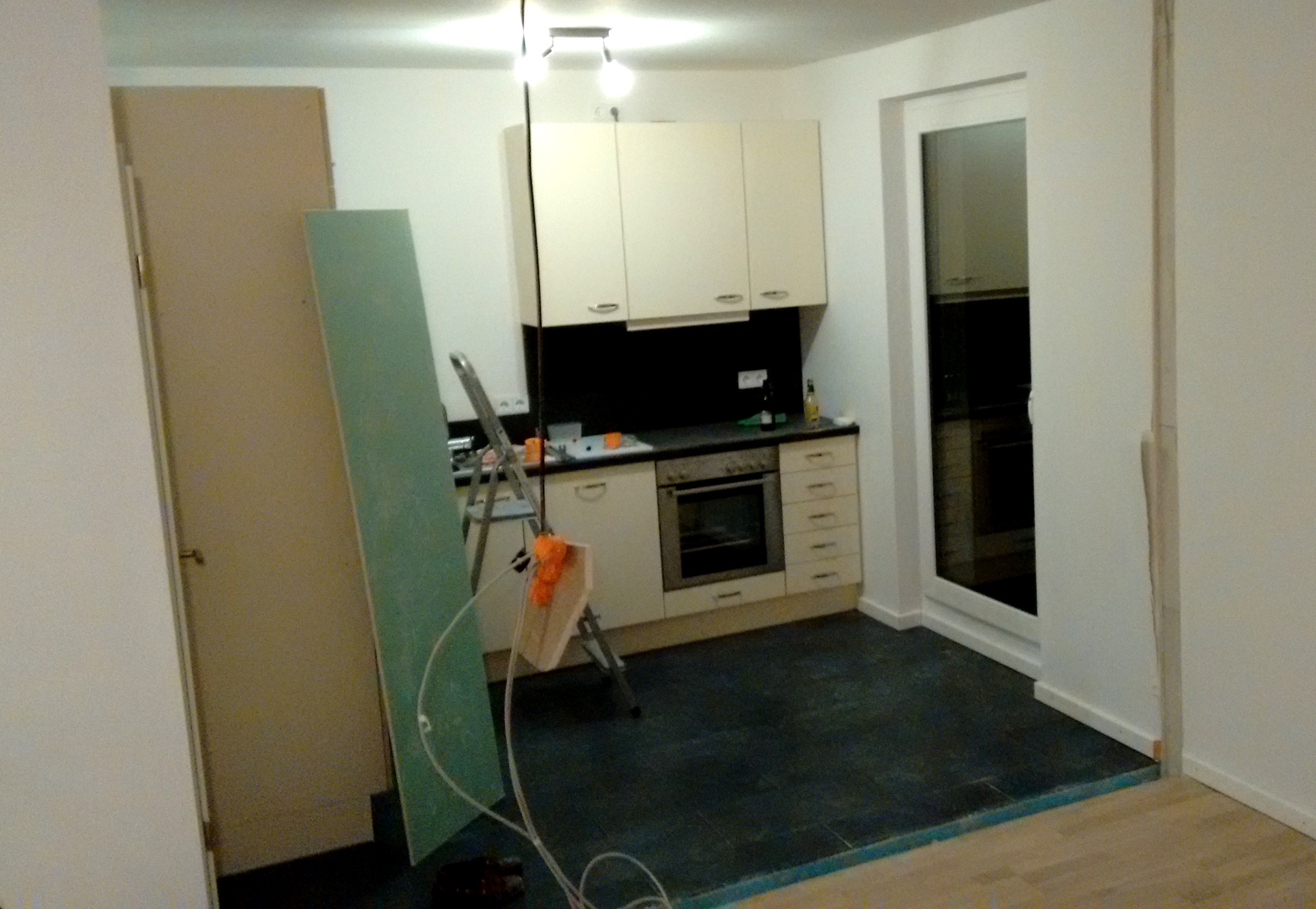 Beim Abriss stellten wir fest, dass beim Hausbau erst die Raumaufteilung festgelegt wurde. Trockenbau und Estrich wurden erst später verarbeitet.  Nach der Entfernung der Wand zeigte sich ein relativ tiefer Schacht bis auf die Kellerdecke. Wir verwendeten trittfeste Dämmung und eine Schüttung bis zur Fliesenhöhe, um den Spalt zu schließen. Mit drei Ersatzfliesen aus dem Keller schlossen die Arbeiten am Boden der neuen Küche ab.