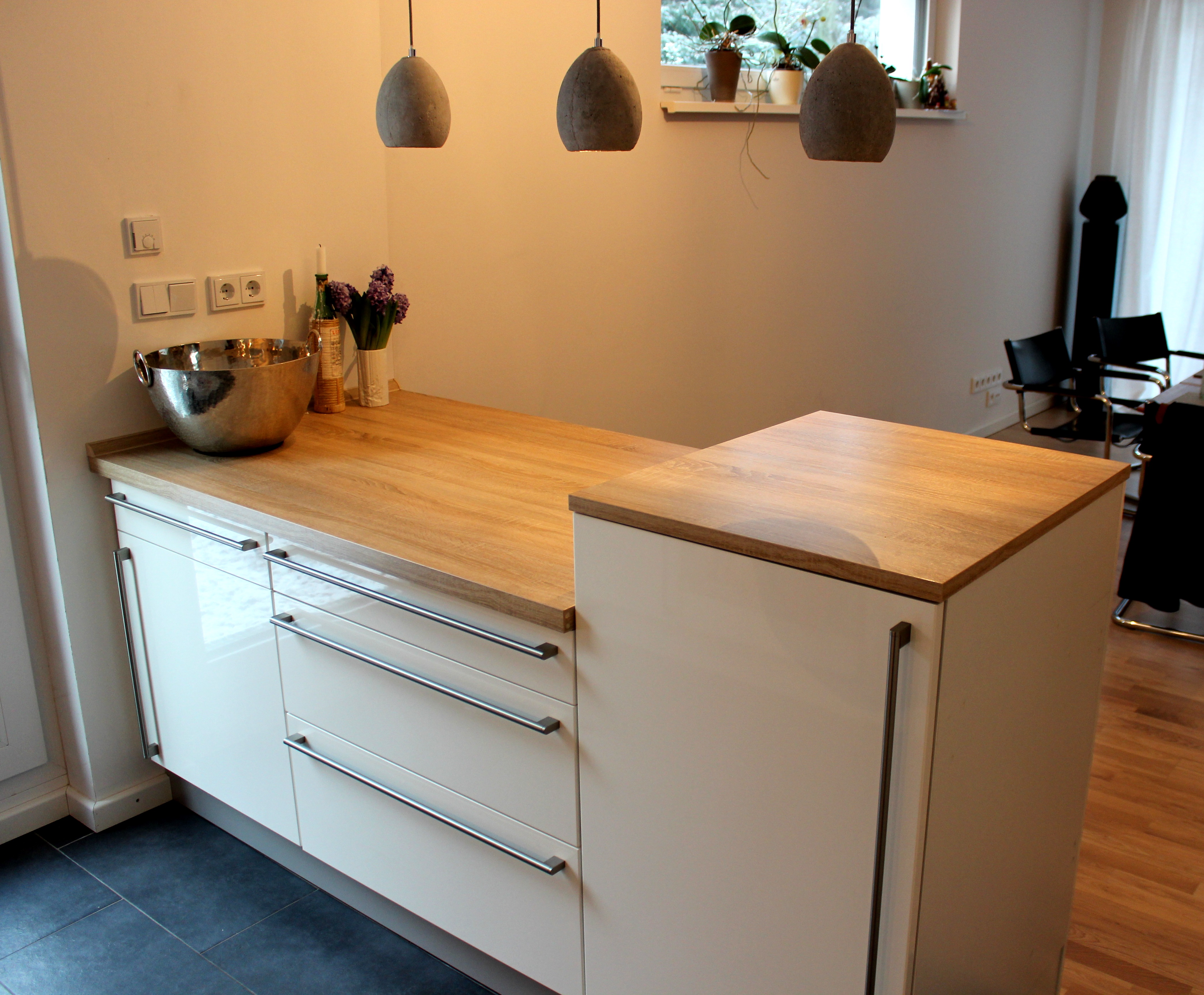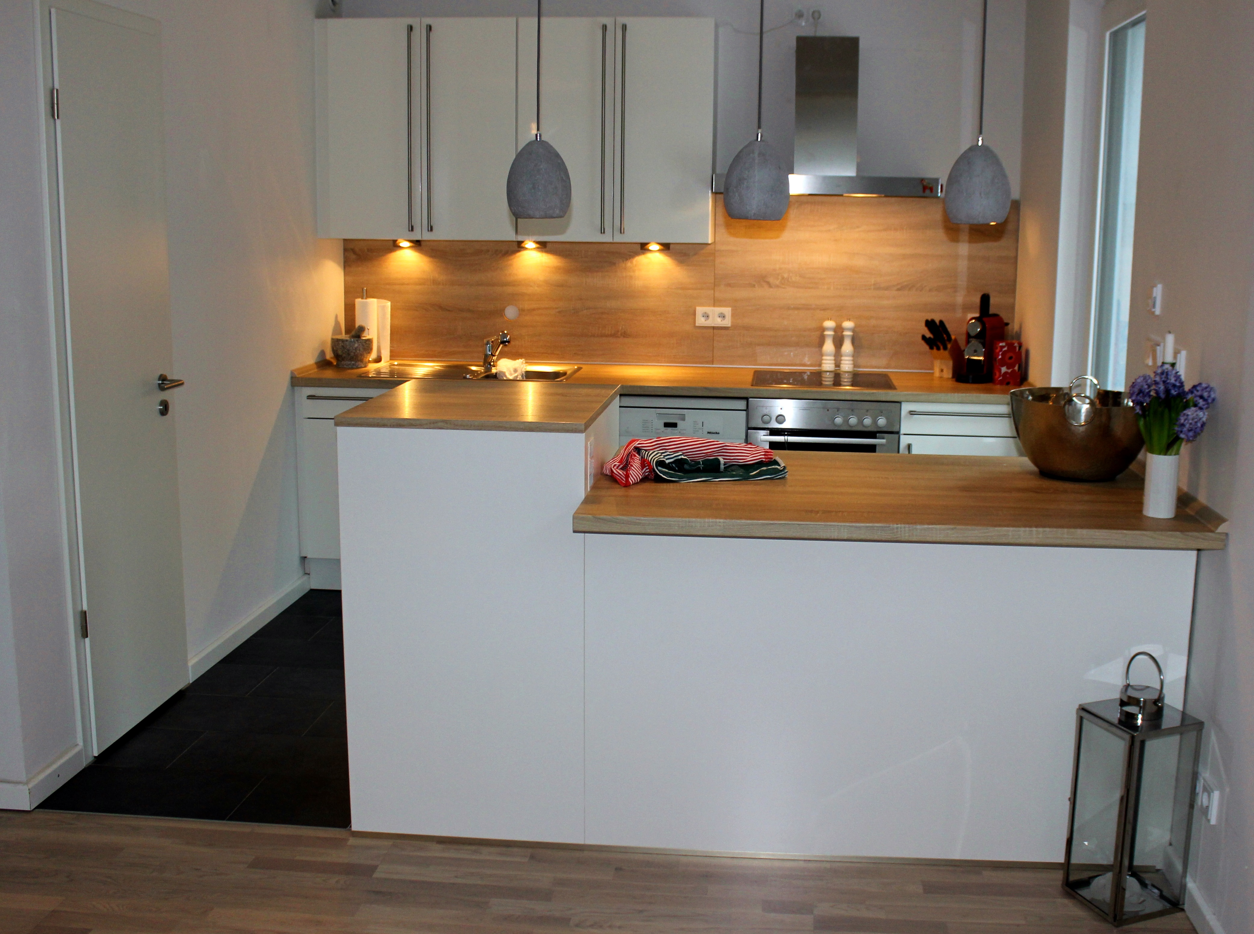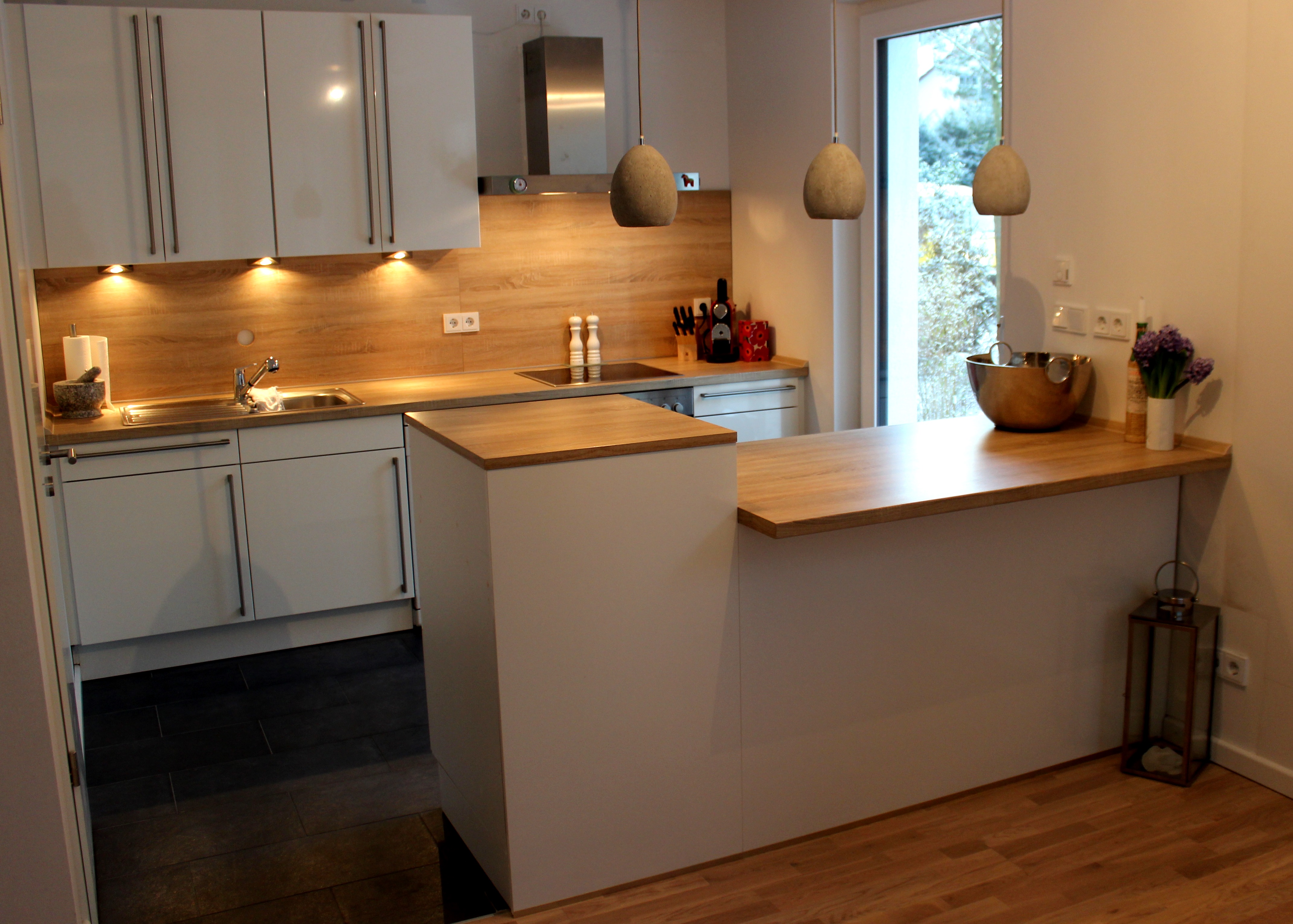 Die Chance für die durchgeführten Umbauarbeiten würde ich immer wieder so nutzen. Die Renovierung und der Umzug mit der eigenen Küche sind sehr zeitintensiv. Es hat sich jedoch in jeglicher Hinsicht gelohnt. Unsere Küche ist hell und wird nun optimal genutzt. Jeden Tag freue ich mich darüber, dass ich mehr Platz zum Kochen habe und einen kleinen Tresen nutzen kann. Er erweist sich als kommunikativer Mittelpunkt dieses offenen Raumes. Mit unserem Besuch stehen wir gerne am Tresen und haben einen schönen Abend. Durch die Kühlschrankhöhe von 1,20m haben wir ein wenig mehr Stauraum gewonnen, den wir gerne nutzen.